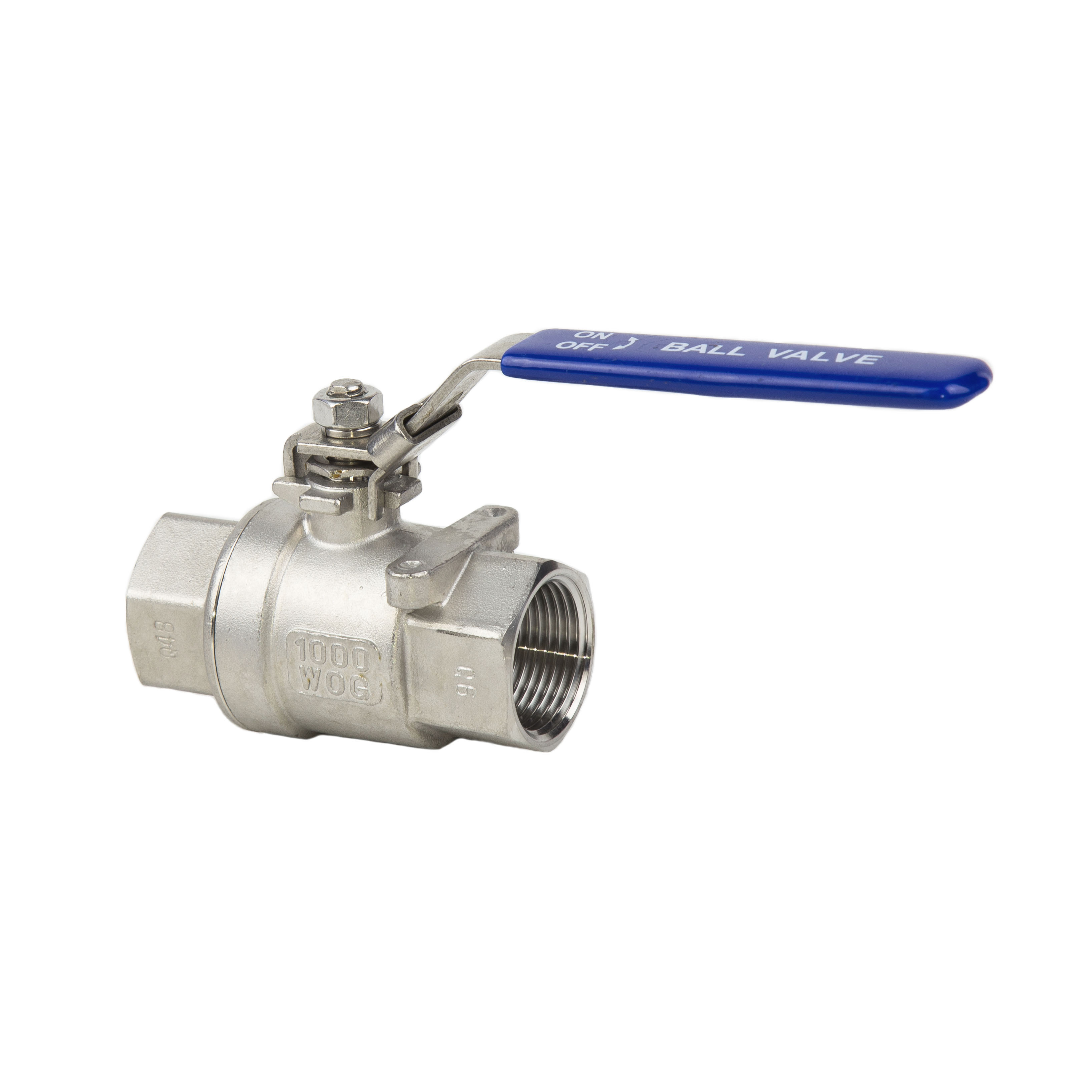 2/2-Wege-Edelstahlkugelhahn, 2-teilig mit vollem Durchgang, PN63, Innengewinde ISO 228, Baulänge nach DIN 3202-M3, Handhebel mit Verschlusslasche.